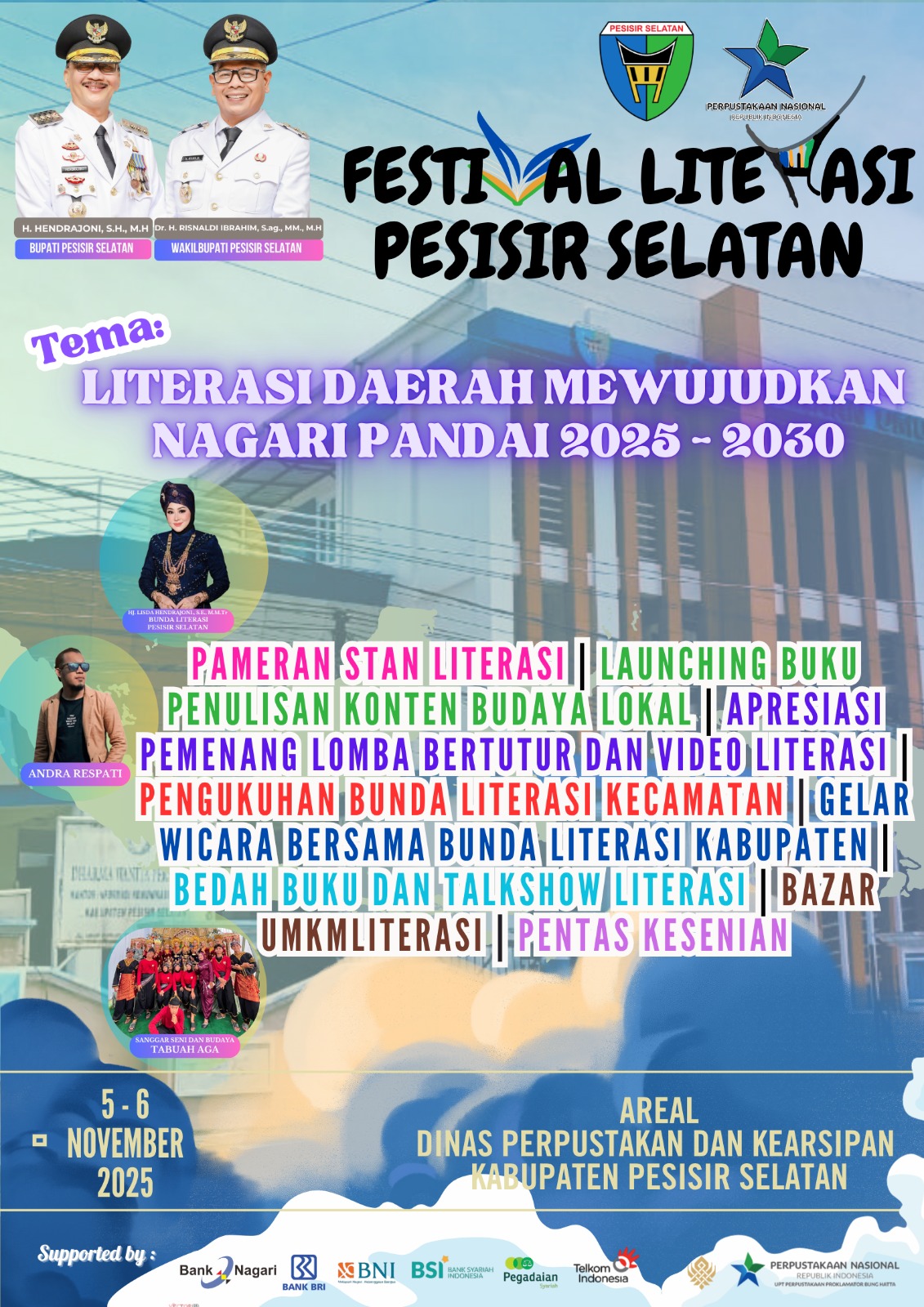 Sebagai Komitmen Pemerintahan Kabupaten Pesisir Selatan dalam mendukung peningkatan literasi masyarakat salah satunya dengan mengadakan Kegiatan Festival Literasi Pesisir Selatan yang diselenggarakan oleh Dinas Perpustakaan dan Kearsipan Kabupaten Pesisir Selatan dengan tema, "Literasi Daerah Mewujudkan Nagari Pandai 2025-2030". Yang akan dilaksanakan pada tanggal 5-6 November 2025 di Area Dinas Perpustakaan dan Kearsipan Kabupaten Pesisir Selatan. Acara ini dimeriahkan oleh artis Andra Respati, dan dihadiri langsung oleh Ibu Hj. Lisda Rawdha Hendrajoni.